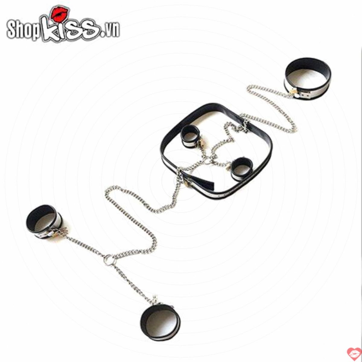Bao gồm còng tay, còng chân, vòng cổ và đai lưng nối liền, bộ sản phẩm giúp bạn thỏa sức sáng tạo với nhiều tư thế và kiểu trói độc đáo. Cụ thể kích thước từng món: