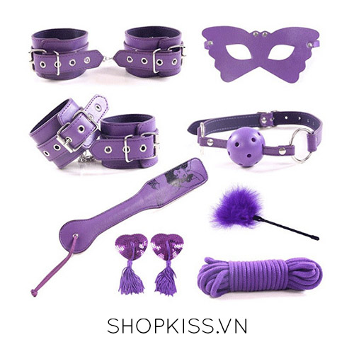 Bộ sản phẩm gồm 8 món đa dạng với gam màu tím mơ màng, gợi cảm, tăng thêm phần quyến rũ cho không gian riêng tư. Toàn bộ được làm từ da thật mềm mại và kim loại không gỉ bền chắc, đảm bảo an toàn khi sử dụng mà không gây tổn thương da. Trọng lượng chỉ 350g nhẹ nhàng, dễ dàng thao tác và bảo quản.